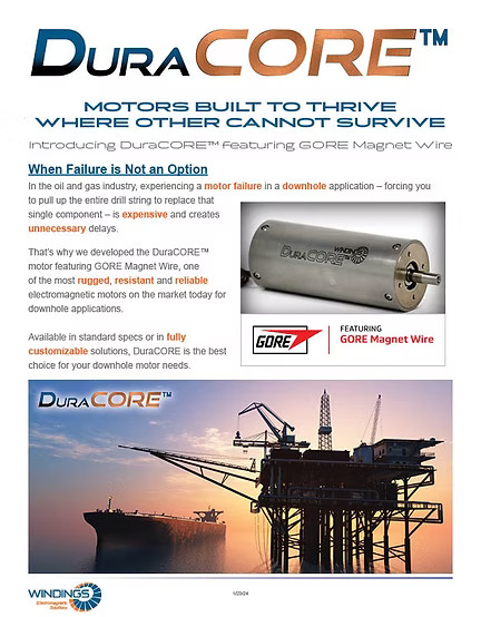 DuraCORE™ motors are Windings latest innovation in providing downhole drilling motor solutions for the oil & gas industry. Thanks to a partnership with W.L. Gore & Associates™, in an effort to create a more durable and resilient motor for the oil & gas industry, Windings engineers were able to utilize GORE Magnet Wire. GORE Magnet Wires ability to survive downhole temperatures up to 260°C, pressure up to 30 Kpsi, and resistance to hydrolysis and flood events. What they created is, one of the most rugged, resistant and reliable electric motors on the market today, made possible due to GORE Magnet Wire’s revolutionary insulation, and superior environmental performance in contrast to the industry standard polyimide insulated magnet wire.